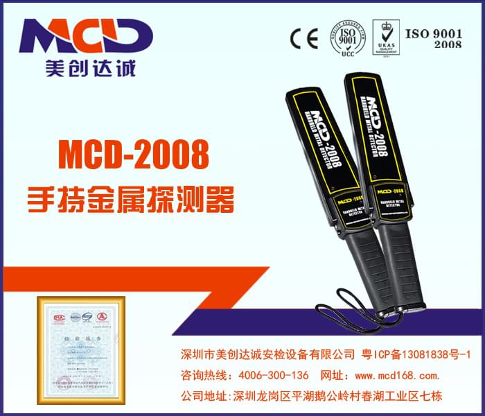 MCD-2008型手持式金屬探測器是深圳美創(chuàng)達(dá)誠經(jīng)過多年的金屬探測研發(fā)生產(chǎn)經(jīng)驗,為助力中國2008奧運火炬接力而特別研發(fā)的一款具有高性能、高性價比的手持金屬探測產(chǎn)品,所有配件全部采用優(yōu)質(zhì)元器件制作,掃描面積大、性能穩(wěn)定、耐用,操作簡單、外型輕穎美觀,并具有高低靈敏度轉(zhuǎn)換功能,當(dāng)探測到金屬時,探測器將發(fā)出音響聲或振動提示,本機可帶耳機功能,可以在環(huán)境喧鬧的情況以及探測結(jié)果不想讓其他人知道的情況下使用。其靈敏度足以探測到大頭針打小的金屬物體。并附帶有外接充電器功能,可在探測器本機進(jìn)行充電。MCD-2008手探廣泛用于機場、工業(yè)區(qū)、政府大樓、學(xué)校、醫(yī)院、會議場所、運動會等需要進(jìn)行安全檢查的場所。