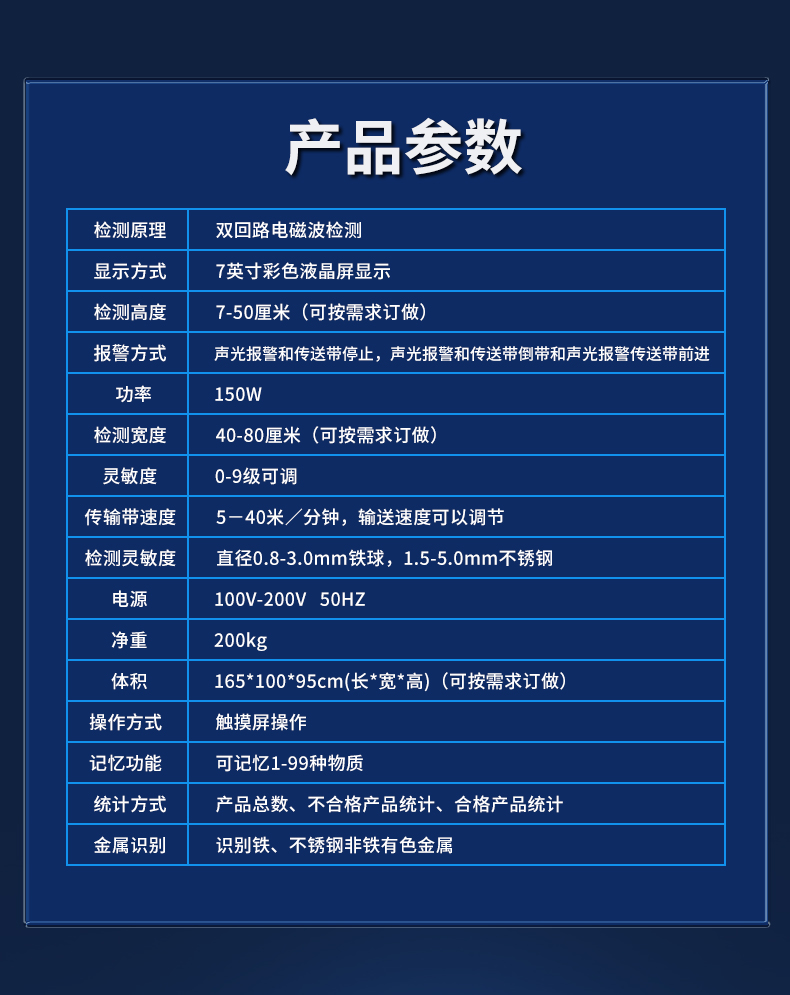 6、檢測靈敏度:直徑0.8-3.0mm鐵球,1.5-5.0mm不銹鋼(探測精度與機(jī)器的高度和寬度有直接關(guān)系,通常高度越高,寬度越寬,機(jī)器的探測精度越低,反之,相反。)