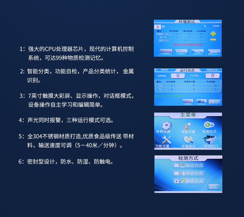 新品上市!MCD-F500QF食品安全金屬檢測用!特別適用于水分、鹽分過高的食品安全檢查,也用于檢查目前行業(yè)里面不能檢查的鋁箔包裝的食品安檢。本型號是美創(chuàng)達(dá)誠安檢設(shè)備有限公司根據(jù)多年從事金屬探測儀研制開發(fā)生產(chǎn)的基礎(chǔ)之上,推出新一代微電腦智能型高靈敏度,高可靠性觸摸屏界面金屬檢測儀,產(chǎn)品采用雙回路電路設(shè)計,性能更穩(wěn)定。新型7寸超大全彩色液晶觸摸屏,雙語菜單設(shè)計,操作更方便、更人性化。此為全金屬檢測儀器,可檢測鐵和非鐵等金屬,靈敏度可分別調(diào)節(jié),帶記憶功能可預(yù)設(shè)6種檢測物質(zhì),對帶水份的產(chǎn)品及冰凍產(chǎn)品有很好的排除性,突破大部分設(shè)備只對磁性物質(zhì)反應(yīng)靈敏的技術(shù)瓶頸,檢測儀采用聲光報警,同時自動排除、停機(jī)、、倒帶功能,人性化菜單,觸摸屏操作方便,整機(jī)采用不銹鋼材料,防腐蝕、不生銹、易清洗。因此廣泛應(yīng)用于食品、藥品、玩具等要求高的物體里的金屬的檢測。其特點及操作介紹如下: