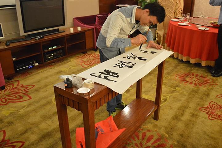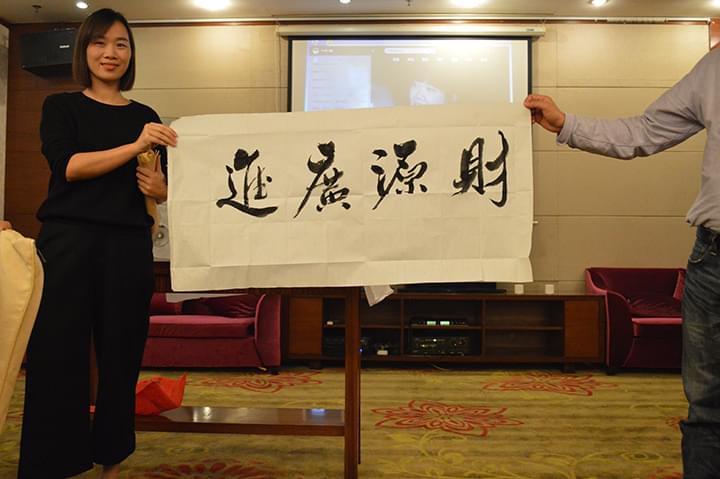 倉(cāng)庫(kù)主管葉紅斌展示毛筆字預(yù)祝美創(chuàng)達(dá)誠(chéng)2016:財(cái)源廣進(jìn)