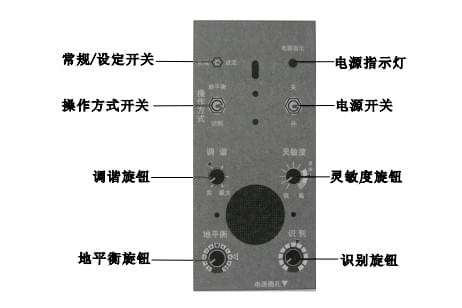 金屬探測器功能分為電源指示燈、旋轉(zhuǎn)按鈕和調(diào)諧旋轉(zhuǎn)按鈕,如下